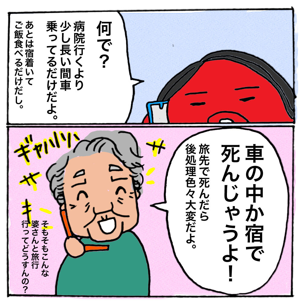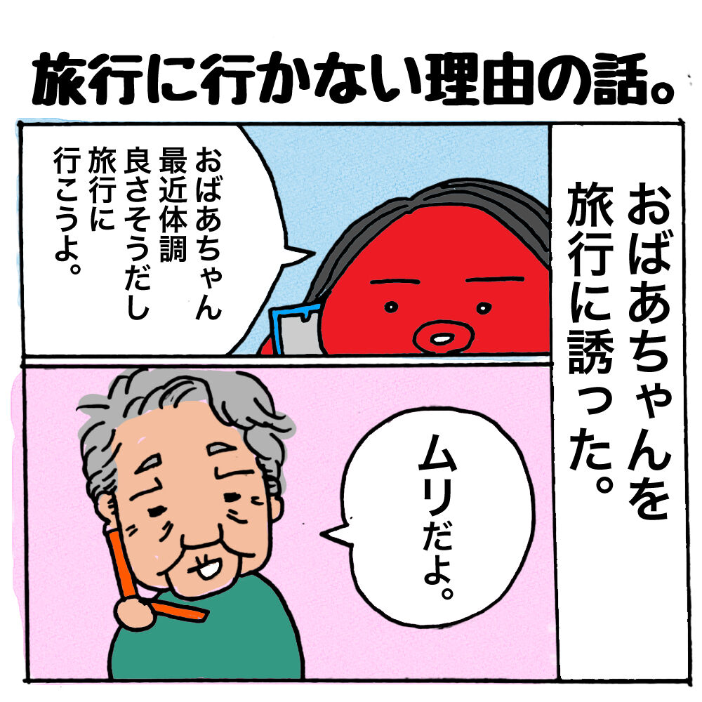 旅行に行かない理由の話。 2021年12月18日 20:43 前回のおばあちゃんの話→ 旅行に誘うと毎度こうなる。もっと他に良い断り文句があるはずだけど。。因みにいつも病院〜ご飯〜家=合計1時間強車に乗ってる。旅行に行く車乗ってる時間とどういう違いがあるのかなあ。このお話の続き。→ スポンサードリンク 「おばあちゃん」カテゴリの最新記事 タグ :#旅行 < 前の記事次の記事 > コメント コメントフォーム 名前 コメント 記事の評価 リセット リセット 顔 星 情報を記憶 コメントを投稿する