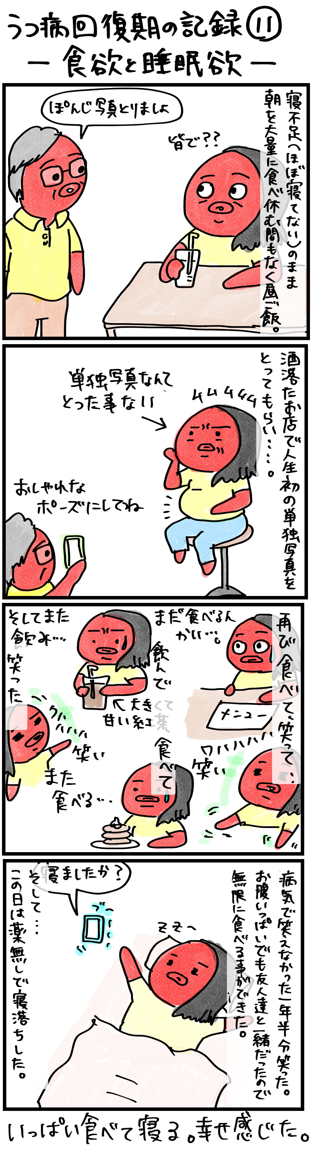 うつ病回復期の記録−11(食欲と睡眠欲) 2025年01月19日 21:00 タイ・バンコク旅行記──数年振りにあう友人達 うつ病回復期のポンコツポンジは友人に会いにバンコクへの旅に出た ・・旅先で回復していくのか?!前回の話⬇️【うつ病回復期の記録−10】 1年以上振りに自然と寝るという体験ができました😊友人の「たくさん食べて、笑って、また食べる」満腹眠り作戦は大成功でした!!数時間後に目は覚めたのですが、薬なしで眠れた事は大きな変化となりました。いっぱい食べて、しゃべって、笑って、また食べて、寝るそれができるって本当に幸せな事ですね😊 ◀︎ 前の話(第10話) 次の話(第12話) ▶︎ -----------うつ病発症の話は以下にまとめています⬇️-------------フォローしていただけると嬉しいです!! スポンサードリンク 「うつ病回復期の記録(連載中)」カテゴリの最新記事 タグ :#うつ病回復期 < 前の記事次の記事 > コメント コメントフォーム 名前 コメント 記事の評価 リセット リセット 顔 星 情報を記憶 コメントを投稿する
