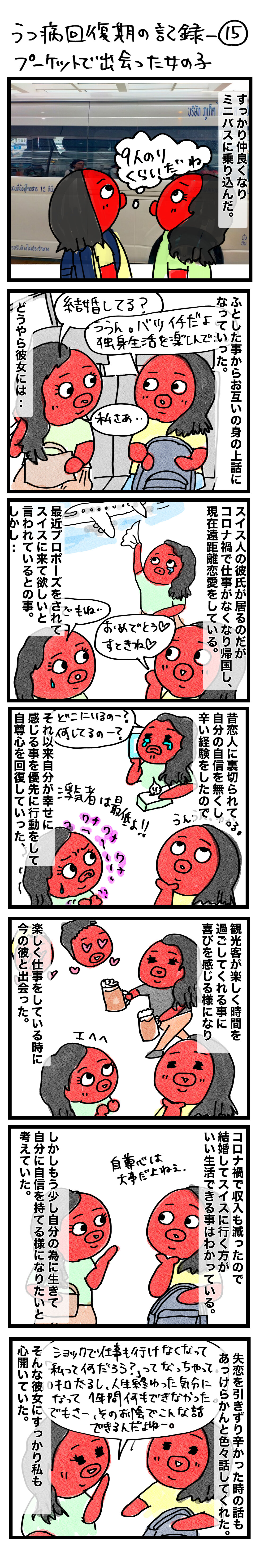 うつ病回復期の記録−15(プーケットで出会った女の子) 2025年01月31日 21:00 ヤオヤイ島&プーケット旅行記──プーケット空港での出会い うつ病回復期のポンコツポンジがプーケット空港に到着。到着早々空港で最高の出会いがあり・・前回の話⬇️【うつ病回復期の記録−14】プーケットの空港で仲良くなった子との話続きです。初めて会った人に自分の失恋経験をあっけらかんと話せるって凄いですよね!!私は自分の話を人に言えないタイプだったのですが彼女のお陰ですっかり心許す事ができました。次回に続きますー。 ◀︎ 前の話(第14話) 次の話(第16話) ▶︎ ------うつ病に罹った話など--------------その他タイに纏わるお話-----【ドラゴンボール】DB好きすぎるタイの青年【想像の上を行くおばあちゃんの生活(タイ編)】 スポンサードリンク 「うつ病回復期の記録(連載中)」カテゴリの最新記事 < 前の記事次の記事 > コメント コメントフォーム 名前 コメント 記事の評価 リセット リセット 顔 星 情報を記憶 コメントを投稿する