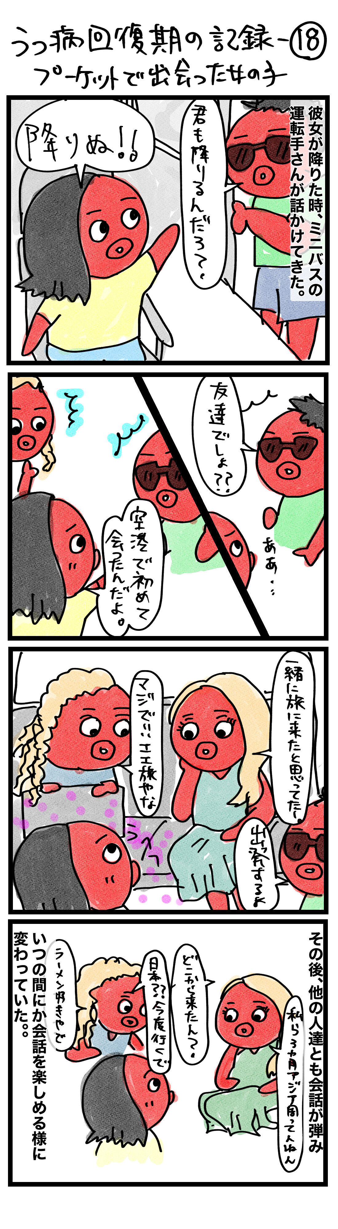 うつ病回復期の記録−18(プーケットで出会った女の子) 2025年02月09日 21:00 ヤオヤイ島&プーケット旅行記──プーケット空港での出会い うつ病回復期のポンコツポンジがプーケット空港に到着し、まさか空港で最高の出会いがあり・・前回までの話⬇️彼女と色々会話をしたお陰で他の人達と会話をする事を楽しいと思えるようになっていました😊プーケットに到着してからすでに4人の人と会話ができとても幸せを感じれました。まだ続きます〜。 ◀︎ 前の話(第17話) 次の話(第19話) ▶︎------うつ病に罹った話など--------------その他タイに纏わるお話-----【ドラゴンボール】DB好きすぎるタイの青年【想像の上を行くおばあちゃんの生活(タイ編)】 スポンサードリンク 「うつ病回復期の記録(連載中)」カテゴリの最新記事 < 前の記事次の記事 > コメント コメントフォーム 名前 コメント 記事の評価 リセット リセット 顔 星 情報を記憶 コメントを投稿する