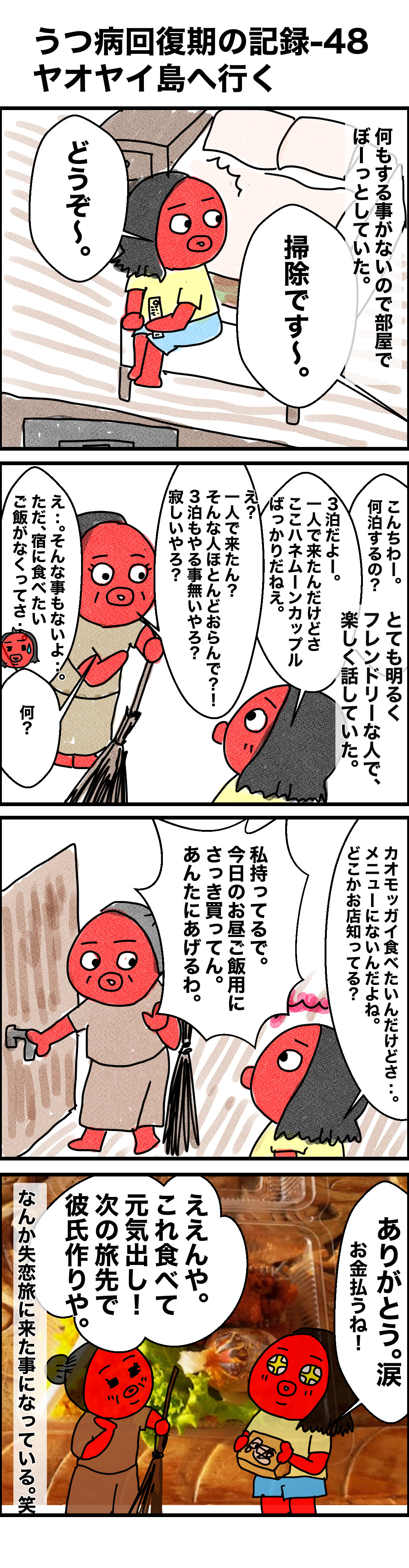 うつ病回復期の記録-48(ヤオヤイ島へ行く) 2025年05月07日 20:07 ヤオヤイ島&プーケット旅行記 うつ病回復期のポンコツポンジがヤオヤイ島のLaem Had Beachを目指すが、結局行けずにホテルに帰ってきた・・・シリーズ初めから⬇️前回の話⬇️よっぽど一人客が珍しい様で、なんで一人できたのかとか?結婚してないんか?などなど色々質問攻めでした😅ヤオヤイ島は小さい島なので、やる事ないのは事実・・。正直言うとぼーっと景色見て過ごすだけなら2泊で充分な島です。一人より家族、友達、恋人ときた方が断然良いと思います!!雨季は特に昼間にやる事が何もないです🌴しかし、色々な方の心遣いのお陰で全く寂しくなく良い時間を過ごせました。 ◀︎ 前の話(第47話) 次の話(第49話) ▶︎ 次回に続きます〜。▼自律神経失調症~うつ病に罹る経緯まとめ▼▼うつ病になった理由を載せています▼覗いていただけると嬉しいです🙇♂️インスタフォロー&読者登録お願い致します🙇♂️ スポンサードリンク 「うつ病回復期の記録(連載中)」カテゴリの最新記事 < 前の記事次の記事 > コメント コメントフォーム 名前 コメント 記事の評価 リセット リセット 顔 星 情報を記憶 コメントを投稿する